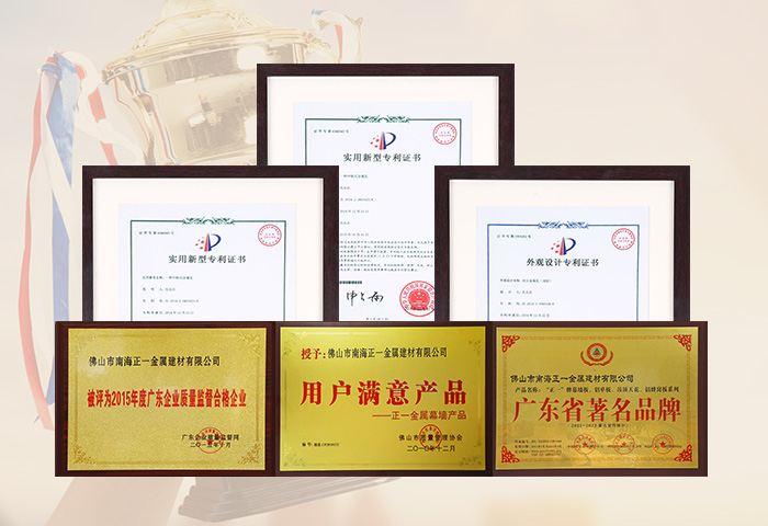 通過ISO9001認證,國家建筑材料測試中心和中國有色金屬華南產品質量監(jiān)督檢驗中心合格檢測,符合美國建筑制造商協會AAMA2605-98涂層標準,被國家建設部認定為建筑鋁合金外墻板、鋁合金天花板定點生產企業(yè)。